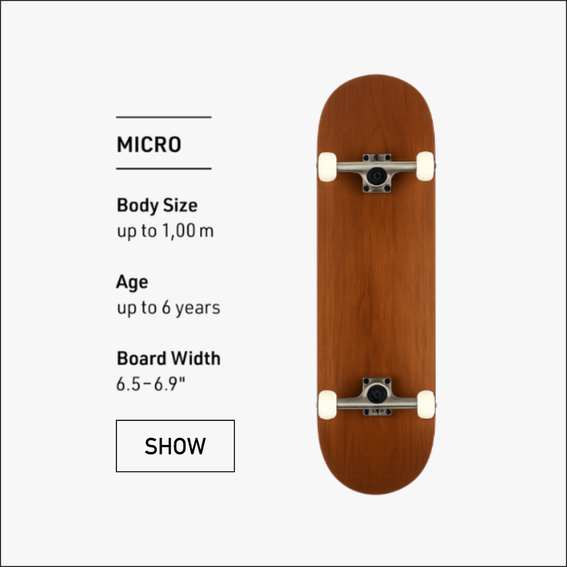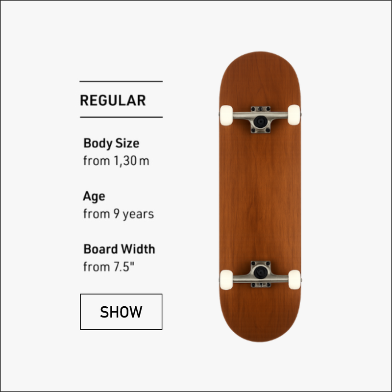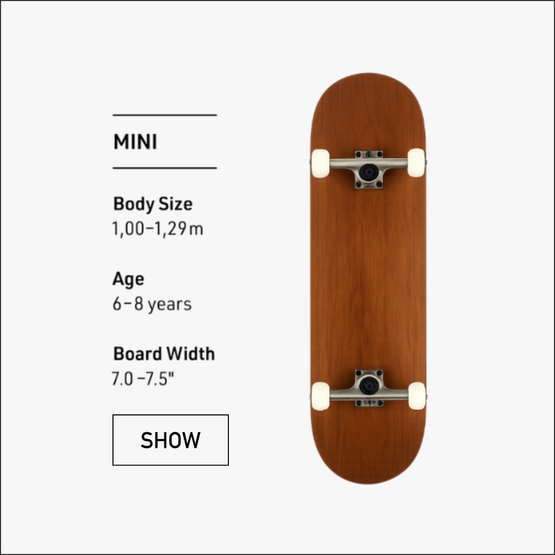 Nel nostro shop online Titus troverai una categoria completamente dedicata agli skateboard per i più piccoli chiamata skateboard completi per bambini, che raggruppa una serie di board più stretti e corti del normale. Questi skateboard sono pensati per bambini e ragazzi fino al 1,30 m d’altezza. Se il bambino è più alto, allora è meglio dirigersi già verso uno skateboard completo classico.
