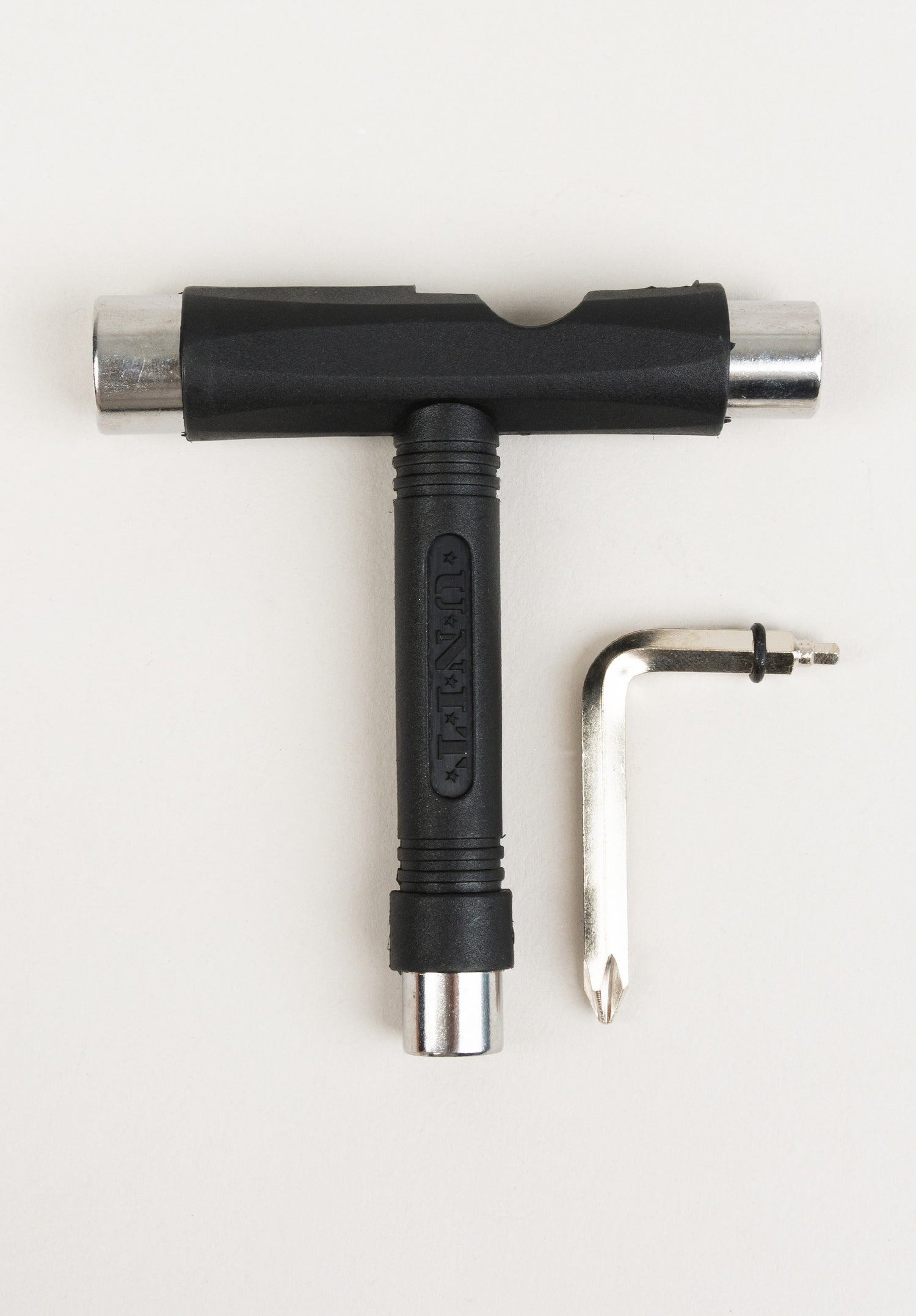 The Unit T-Tool is a multi-functional skate-tool with a removable Phillips-head / Allen-key screwdriver. It has three different sized wrenches for your kingpins, your axles, and your mounting kit. The T-Tool is available in various colors.